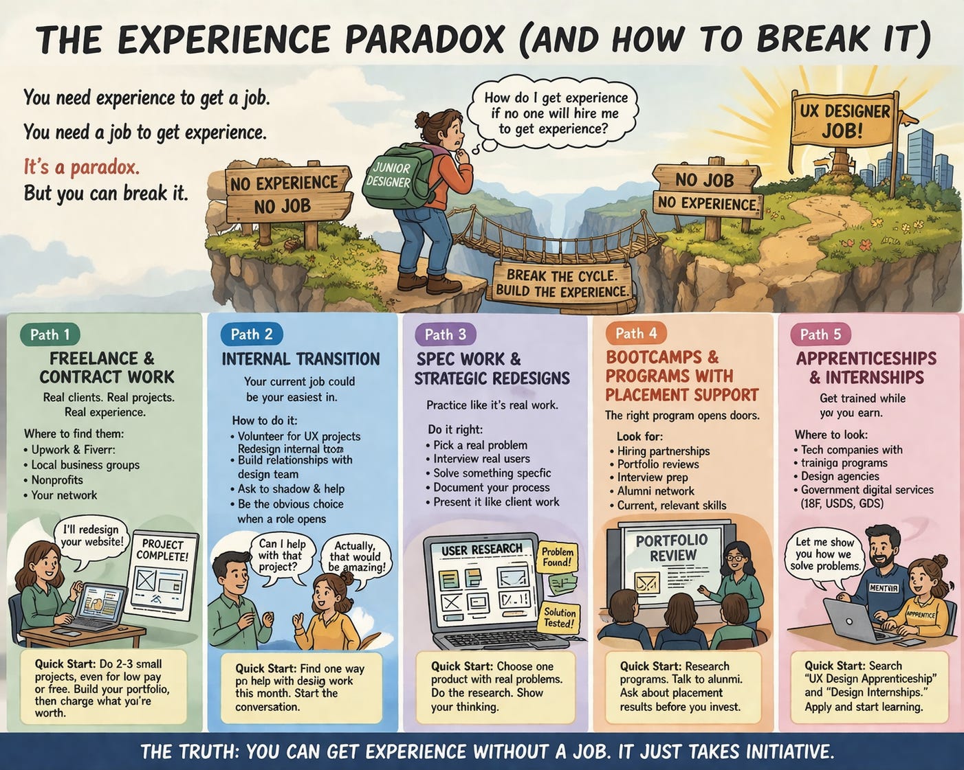 The common thread: All of these paths involve doing real work before you have a “real job.” The experience paradox isn’t actually a paradox. You can get experience without employment. It’s just harder and requires more initiative.